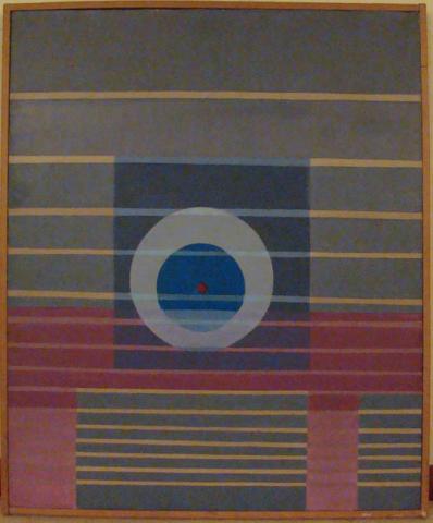 Obra bidimensional de formato rectangular y disposición vertical. Composición abstracta y geométrica con líneas horizontales, planos de color con degradados sobrepuestos y al centro dos círculos. Marco de madera.