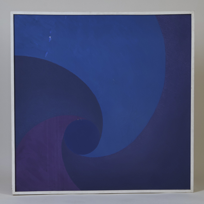 Obra bidimensional de formato cuadrado. Composición abstracta en espiral, centro en forma circular en la esquina izquierda inferior. Colores azul, rojo y marrón. Marco de madera color blanco.