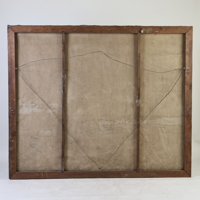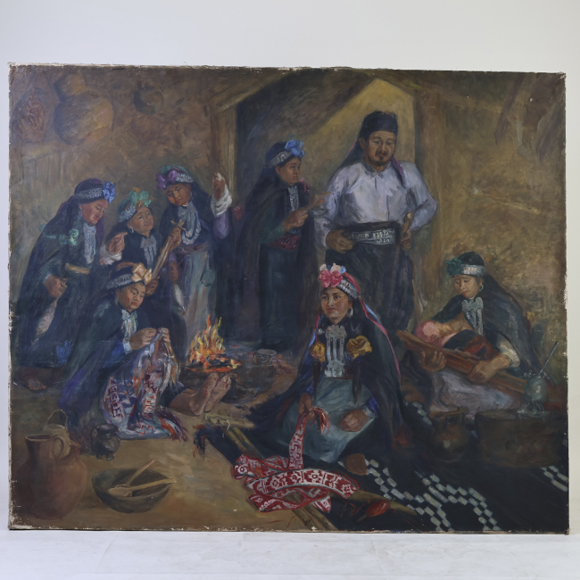 Obra bidimensional de formato rectangular y disposición horizontal. Representación figurativa con un grupo de ocho personas con vestimentas mapuches reunidos junto al fuego.