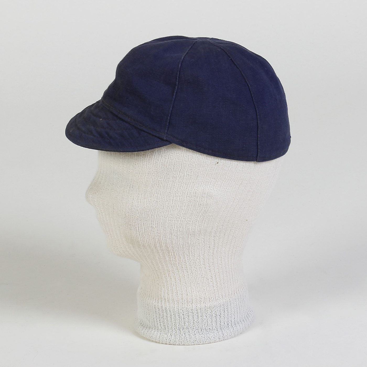Gorra de niño de sarga de algodón de color azul con visera redonda de 4,7 cms de ancho. El gorro está formado por 6 piezas de forma triangular unidas al centro. La visera presenta 5 líneas de pespunte que separan un relleno que otorga rigidez a la visera.