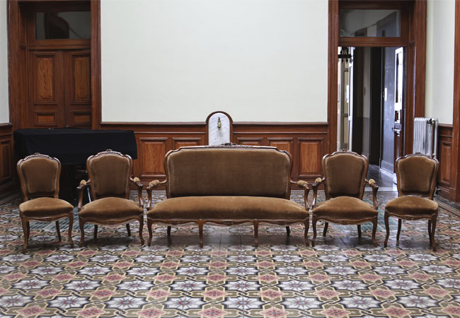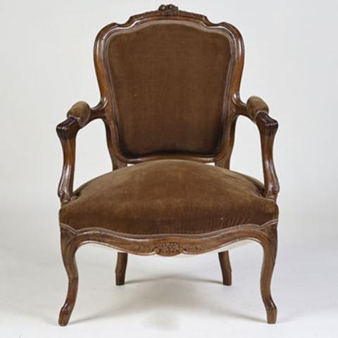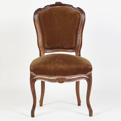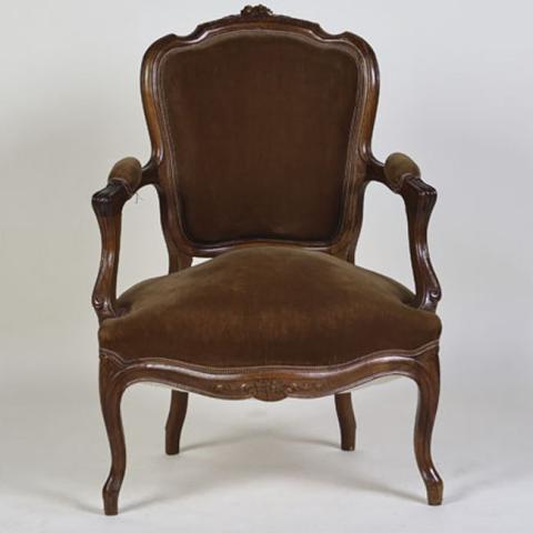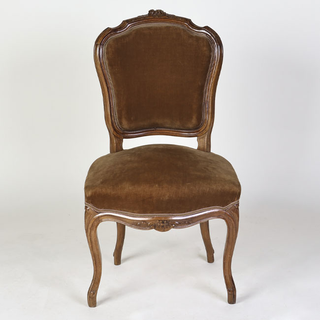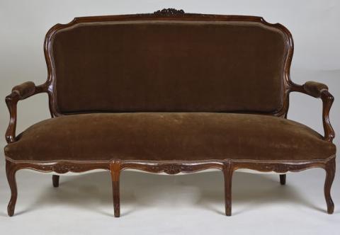 Sillería compuesta por un canapé y cuatro sillas de estructura de madera. El conjunto mantiene diseño y factura similares. El canapé, de tres cuerpos posee respaldo alto curvo y brazos laterales. Las sillas son unipersonales, con respaldo alto curvo y brazos. Todos los asientos están tapizados en tono marrón en respaldo y asiento, con patas torneadas, delgadas y curvadas.