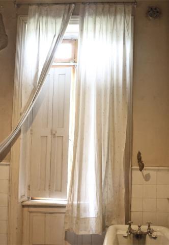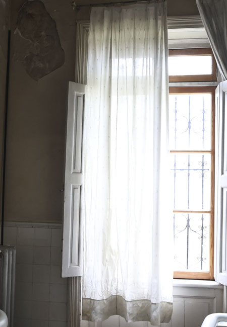 Tela blanca, translúcida, de forma rectangular y proporción alargada. Mucho más larga que ancha, con diseño de patrón de puntos distribuidos uniformemente en la superficie.