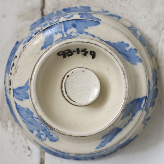 Objeto circular empotrado en la pared, con borde decorativo en relieve y centro liso con un botón blanco. Fondo con patrón en tonos blancos y azules de flores.