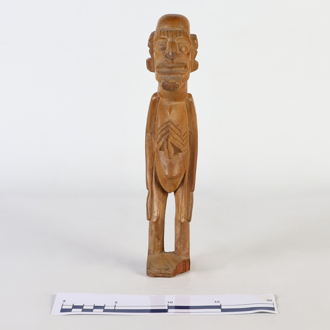 Escultura tallada en madera que representa una figura humana de pie, con brazos rectos a los costados y piernas unidas. Presenta rasgos faciales definidos, cabello recto y con flequillo y un grabado geométrico en el torso con forma de triángulos superpuestos. La pieza es de color marrón claro y de superficie lisa, con proporciones alargadas y base plana.