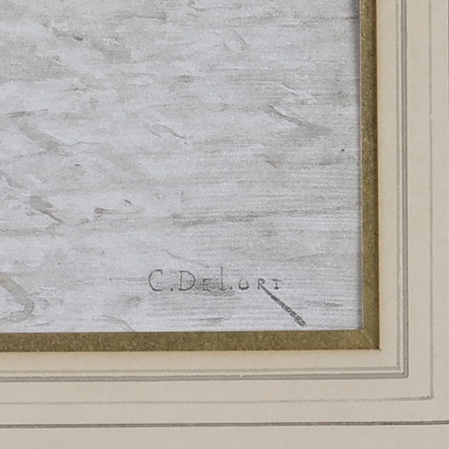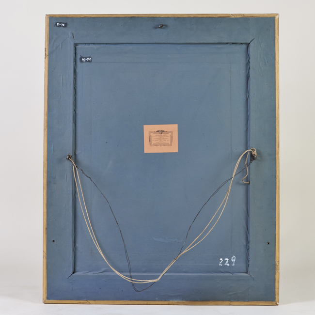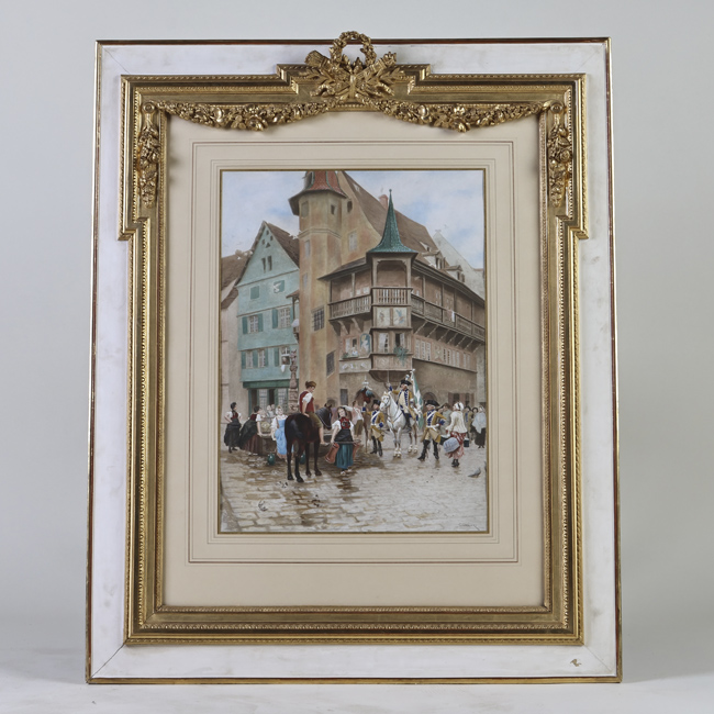 Obra visual, de formato rectangular y disposición vertical. Esta enmarcada en marco dorado, con decoraciones en la parque superior. En la obra se observa un grupo de personas de pie y dos personas a caballo. En segundo plano se observan casas a tres niveles.