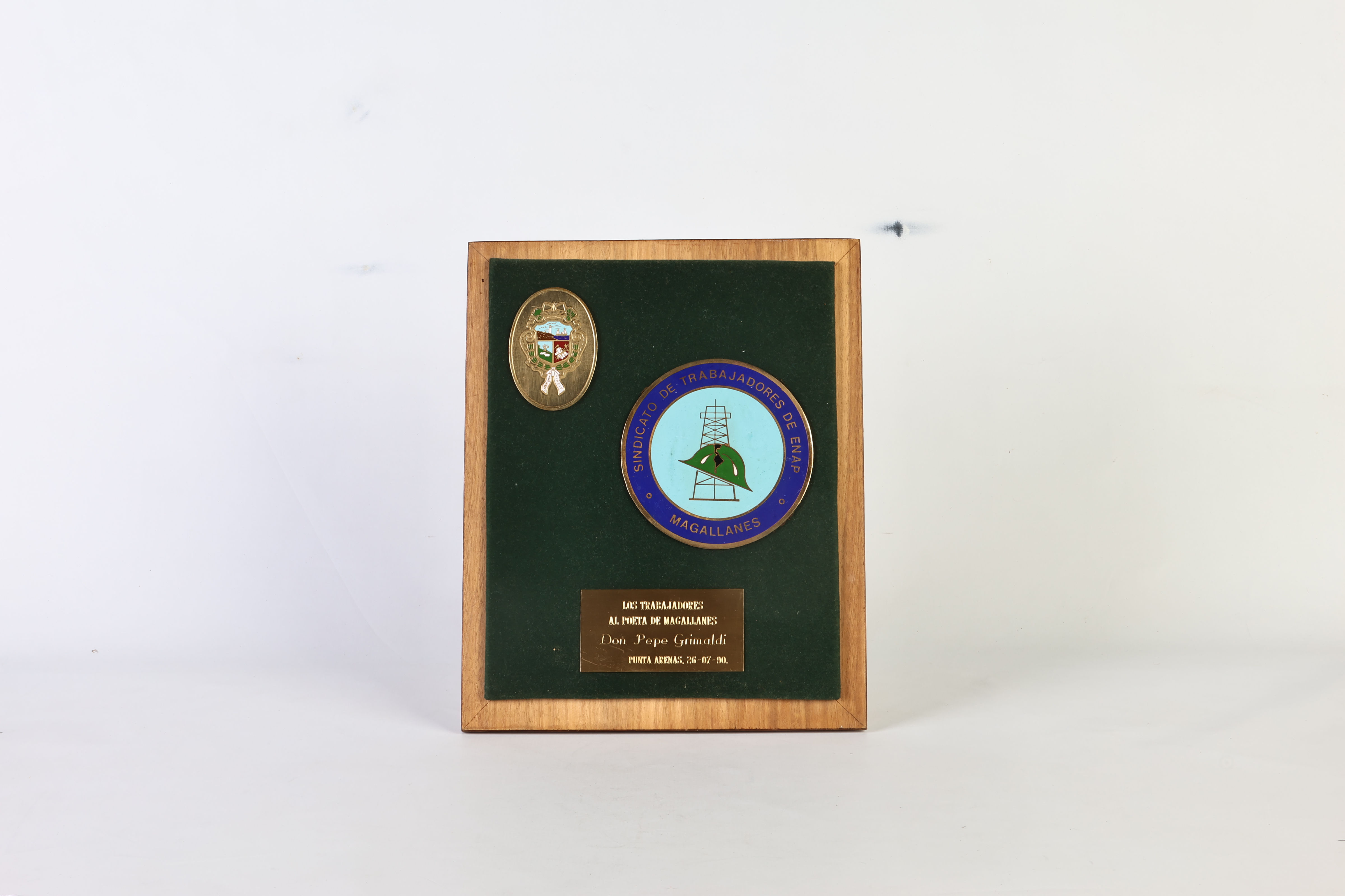 Objeto conmemorativo, de forma rectangular y disposición vertical. De fondo verde y márgenes de madera. En la parte superior izquierda se observa un escudo. En la parte central derecha del objeto hay un logo del sindicato de trabajadores de ENAP Magallanes. Y en la parte inferior un grabado que dice "Los trabajadores al poeta de Magallanes Don Pepe Grimaldi, Punta Arenas 26-07-1990"