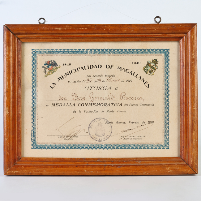 Documento de formato rectangular, de orientación vertical. En el se observan textos regulares en imprenta. Al centro se encuentra el texto, esta rodeado márgenes decorados en tono azul. Esta enmarcado, en marco de madera.