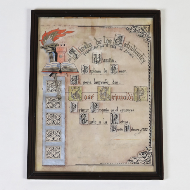 Documento de disposición vertical, con textos en imprenta, en la parte izquierda tiene un dibujo de una torre con una antorcha y un libro abierto, al centro tiene textos donde se lee "Fiesta de los estudiantes auspiciado por el club de leones. Vicuña. Diploma de honor. Al poeta laureado Don José Grimaldi P. Primer premio en el concurso Canto a la reina. Vicuña, Febrero 1952" Está enmarcado en marco de madera.