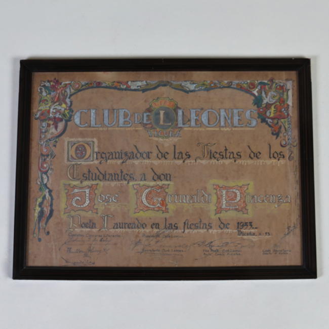 Documento de formato rectangular, de orientación horizontal, con textos en imprenta. Donde se lee "Club de Leones. Organizador de las Fiestas de los Estudiantes a Don José Grimaldi. Poeta laureado en las fiestas de 1953". Enmarcado en marco de madera.