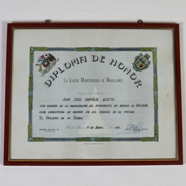 Documento de formato rectangular, de orientación vertical. En el se observan textos regulares en imprenta. Al centro se encuentra el texto, esta rodeado márgenes decorados en tono verde. Esta enmarcado, en marco de madera.