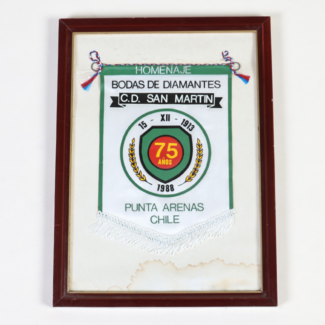 Textil de formato rectangular dispuesto en posición vertical, enmarcado en madera. Presenta una franja verde en los bordes superior y lateral izquierdo, con una trenza decorativa en colores rojo, blanco y azul en las esquinas superiores e inferiores izquierdas. En el centro se observa un circulo con borde verde y amarillo que contiene un fondo rojo con la inscripción "75 años" en amarillo. Al rededor del circulo se leen las fechas "15-XI-1913" Y "1988" En la parte superior izquierda se encuentra el texto "Homenaje bodas de diamante C.D. San Martin" y en el sector derecho inferior la inscripción "Punta Arenas Chile" En el borde inferior presenta una franja de flecos blancos.
