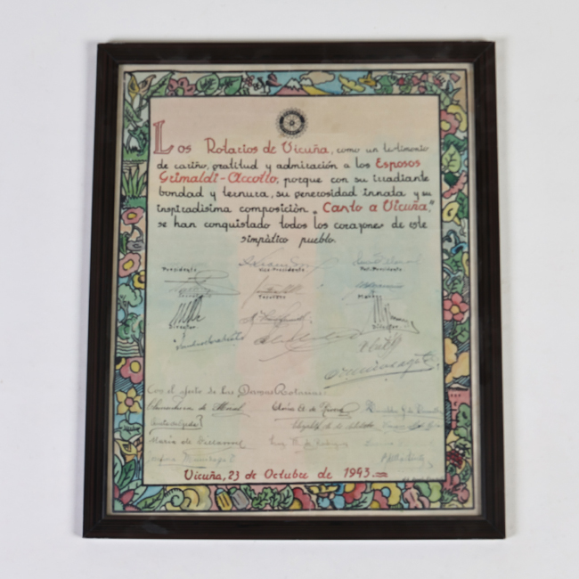 Documento de disposición vertical, tiene textos regulares en imprenta y en castellano. El texto se encuentra en el centro y esta rodeado por un margen de un decorado de flores y hojas. Está enmarcado en marco de madera.