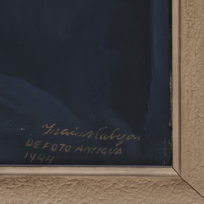 Retrato de medio cuerpo de una figura masculina con uniforme militar azul oscuro y charreteras doradas, sobre fondo liso. Está enmarcado en marco de madera.