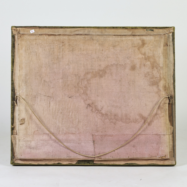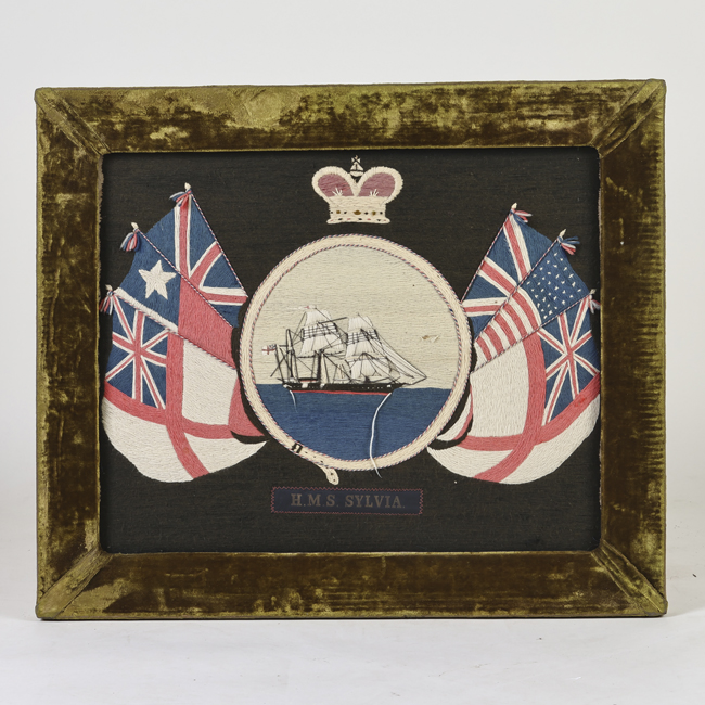 Pintura de formato rectangular enmarcada con borde dorado. En el centro presenta una composición con un barco de velas dentro de un ovalo blanco con borde dorado. Alrededor se disponen varias banderas, entre ellas la de Chile y del Reino Unido, formando un conjunto simétrico. En la parte inferior derecha del ovalo se observa la inscripción "H.M.S. SYLVIA" sobre fondo azul. En la parte superior del ovalo se ubica una corona rosada y blanca.