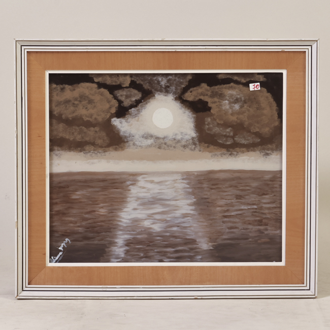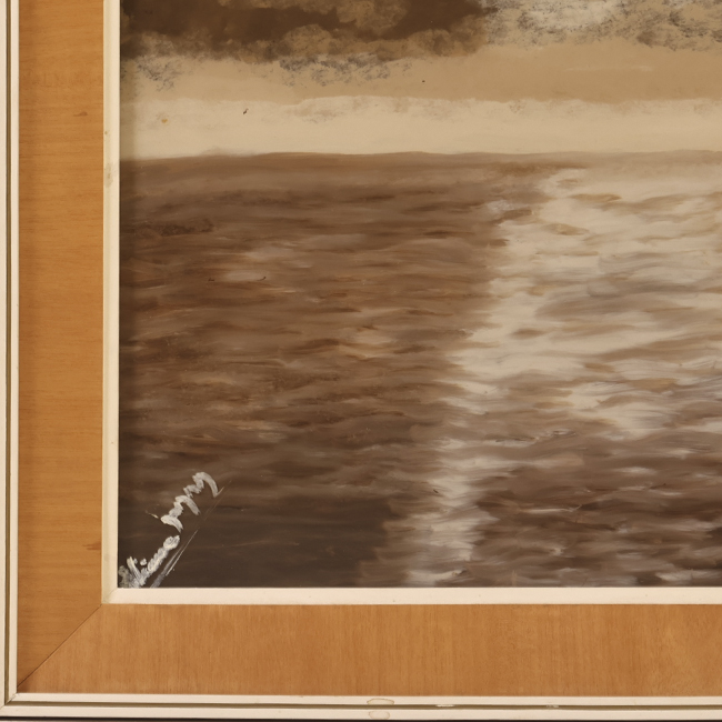 Pintura en formato rectangular horizontal que representa un paisaje marino en tonos sepia. En la composición se observa un cuerpo de agua en primer plano, con reflejos claros que sugieren la luz de un sol en el centro superior, parcialmente cubierta por nubes oscuras. La obra utiliza una paleta monocromática en gamas de marrón, blanco y beige.