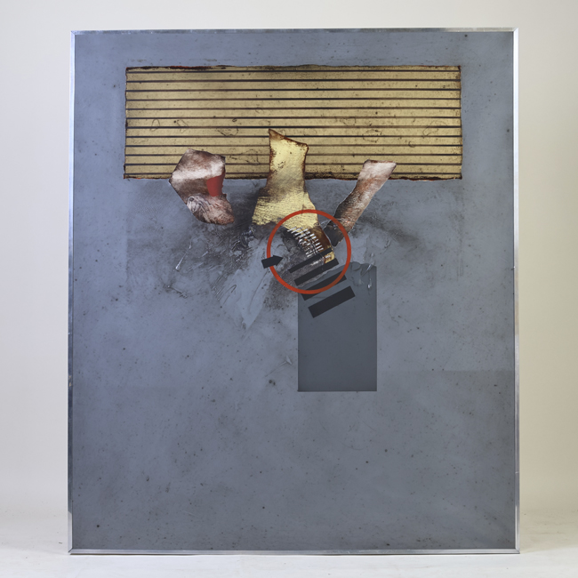 Pintura de formato rectangular con fondo de color gris azulado. En la zona izquierda se observa un rectángulo vertical con líneas paralelas en tonos beige y marrón. Sobre él, se disponen fragmentos irregulares en tonos rosados que simulan formas orgánicas, En el centro hay un circulo anaranjado que encierra un conjunto de elementos geométricos pequeños en negro y blanco. A la derecha, se distingue un rectángulo gris liso.