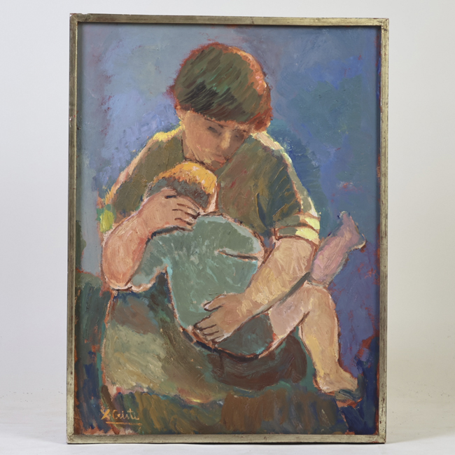 Pintura de disposición vertical cuya composición muestra dos figuras humanas en posición sentada, donde la figura de mayor tamaño sostiene a la menor en brazos. Las formas son simplificadas y delimitadas por contornos marcados, con aplicación de pinceladas visibles que aportan textura. Predominan tonos cálidos en las figuras, como ocres, marrones y naranjas, en contraste con un fondo en gamas frías de azul y violeta sin elementos definidos. La figura menor viste una prenda verde y presenta extremidades en tonos claros, mientras que la mayor lleva vestimenta oscura. En la esquina inferior izquierda se observa la firma “K. Cinti”.