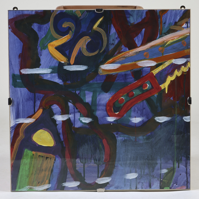 Pintura de formato rectangular con fondo predominante azul. En la superficie se observan líneas curvas y onduladas de color café que recorren el espacio de manera entrelazada. Sobre ellas, se disponen formas geométricas y alargadas en tonos rojos, amarillos, verdes y naranjas, algunas con detalles circulares o punteados. También se observan figuras en espiral y trazos blancos verticales distribuidos en distintas zonas del plano.