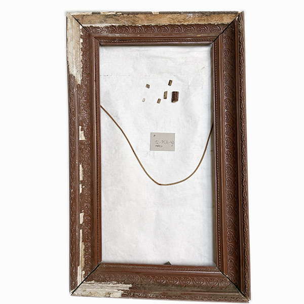 Obra visual, de forma rectangular y disposición vertical. Su composición se basa en un paisaje, donde se ve un camino y al los laterales de él, se ven arboles de troncos delgados y hojas verdes, a su lado se ven colinas que se levantan desde los márgenes del camino.