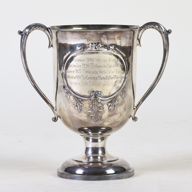 Copa metálica de tono plateado con base circular escalonada, cuerpo abombado y cuello estrecho. Presenta dos asas laterales simetricas, delgadas y curvadas hacia el exterior con terminaciones en espiral. En la parte frontal del cuerpo se observa un grabado enmarcado por un relieve decorativo con formas vegetales. La superficie muestra acabado brillante.