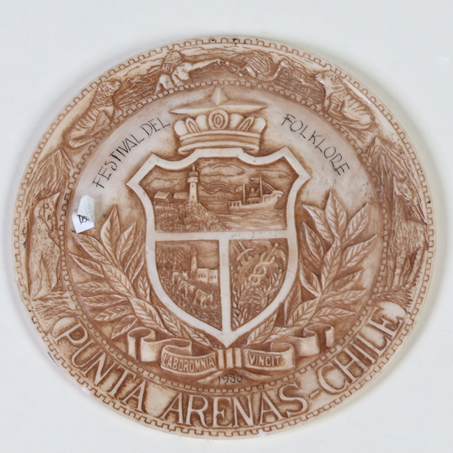 Objeto de cuerpo circular, con relieve decorativo en toda la superficie. En el centro presenta un escudo dividido en tres campos con figuras. Alrededor del escudo se observan ramas y cintas ornamentales. En el borde exterior se lee la inscripción "Festival de folklore - Punta Arenas - Chile"