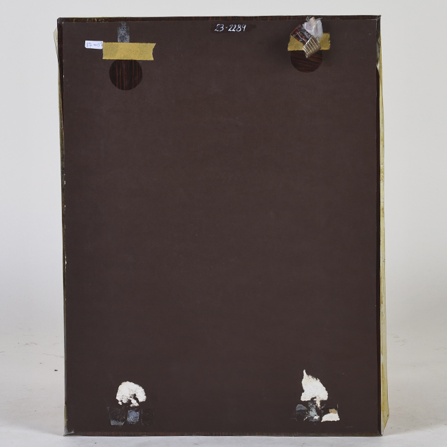 Documento de disposición vertical, tiene textos imprentas en español en su lateral izquierdo y en la parte superior tiene un margen decorativo en tonos amarillos y azules. Esta sobre base de madera.