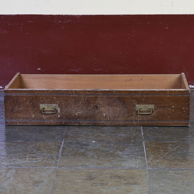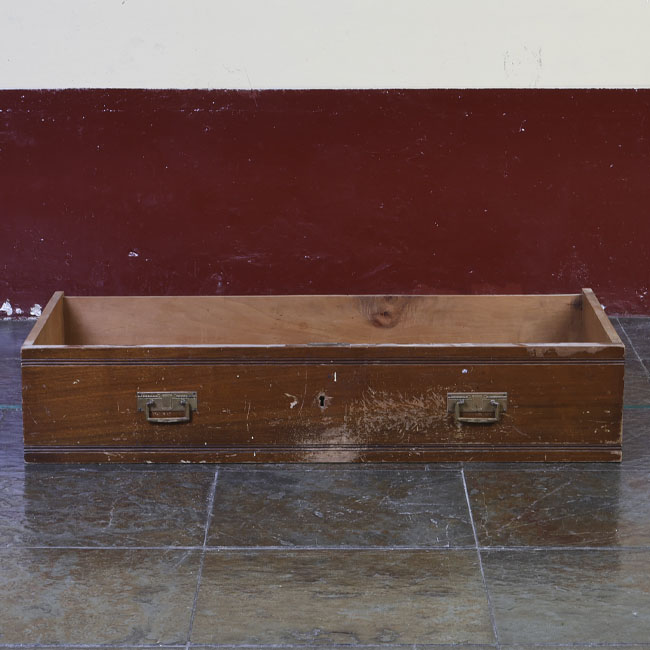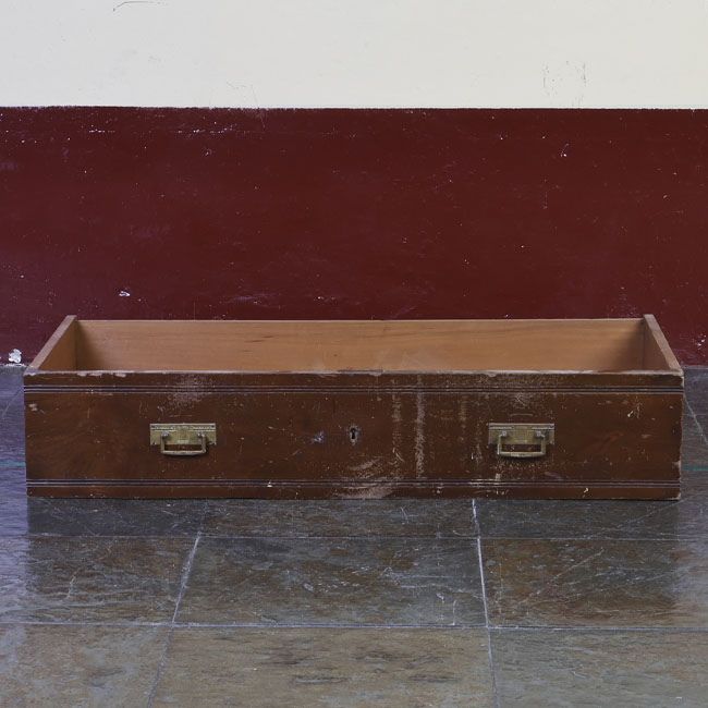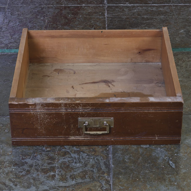 Mobiliario para guardar, es un prisma rectangular y su estructura de madera; está compuesto de tres cajoneras de disposición vertical en hilera, sobre ellas dos cajoneras más pequeñas dispuestas en paralelo, cada una con un tomador metálico.