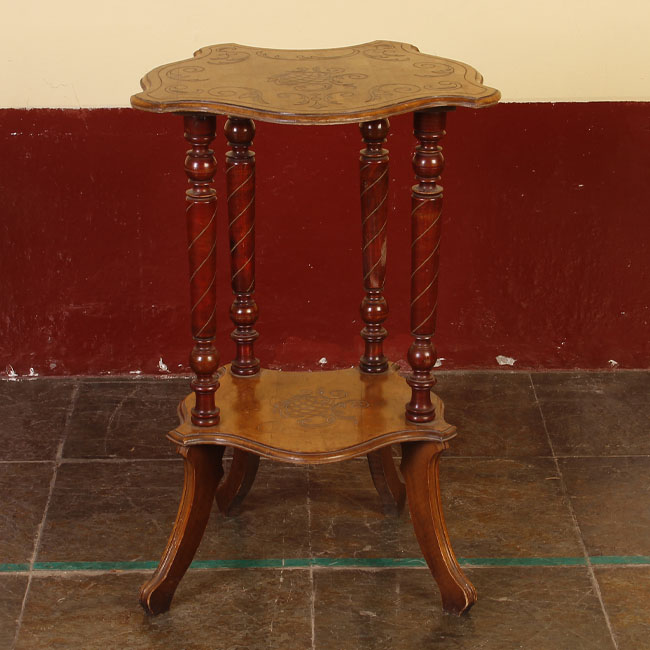 Mesa de madera, con bordes sinuosos, compuesta por dos niveles de cubierta. Ambas superficies presentan decoración tallada con motivos florales en el centro. La estructura esta unida por cuatro patas torneadas con diseño helicoidal, dispuestas en pares y unidas entre si. Las patas inferiores son curvas y se abren hacia el exterior.