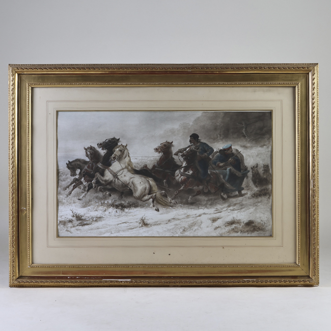 Obra de formato rectangular. Composición basada en un trineo con dos figuras masculinas en su interior que va tirado por seis caballos al galope en un paisaje nevado. En el borde derecho se observan los canes en un segundo plano, en una postura quieta.