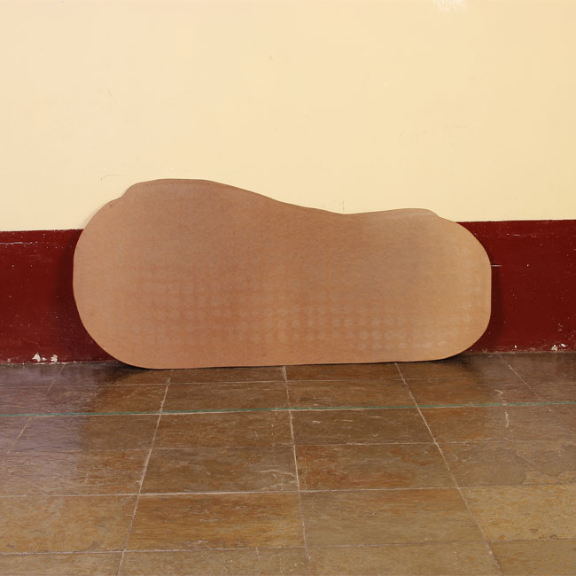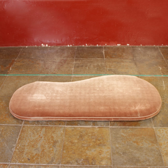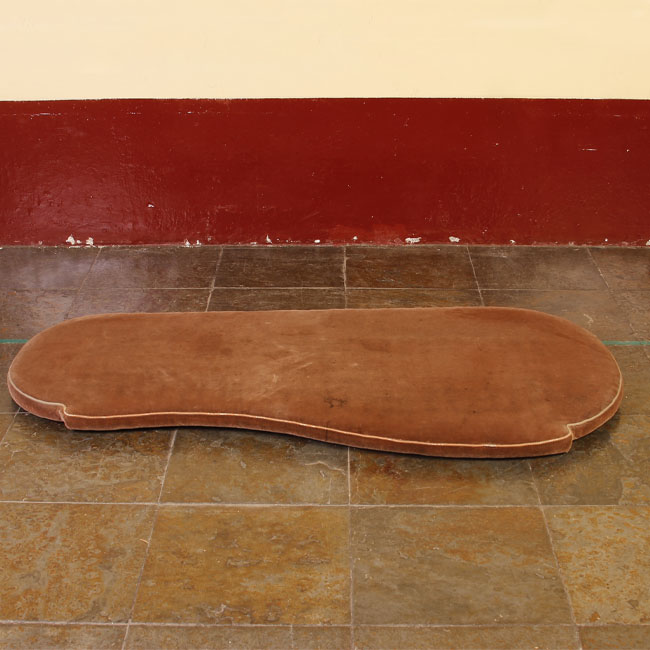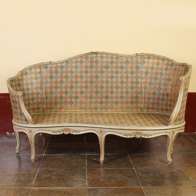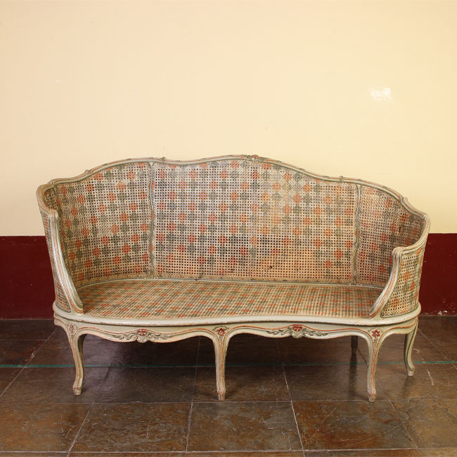 Mobiliario de asiento de tres cuerpos con estructura de madera tallada y pintada en tono claro. Presenta decoración floral distribuida en el borde superior, apoya brazos y base. El respaldo y el asiento están conformados por un entramado de mimbre. El mueble se apoya en ocho patas curvas integradas a la estructura.