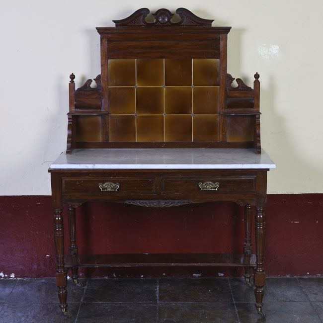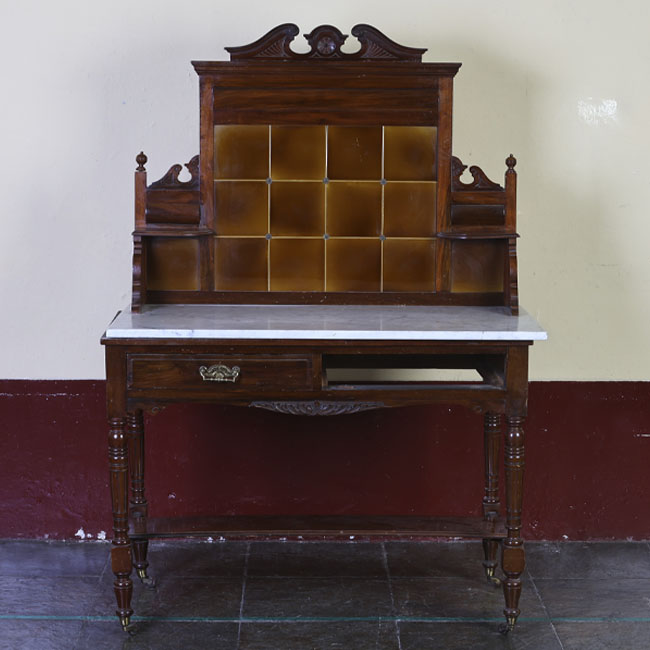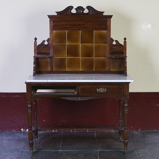Mueble de disposición vertical compuesto por una base con cubierta de mármol blanco y una estructura superior de madera oscura decorada con paneles rectangulares. Presenta dos cajones frontales con tiradores metálicos ornamentales, sostenidos por cuatro patas torneadas unidas por un travesaño inferior. En la parte superior se alza un respaldo con detalles tallados y dos pequeños estantes laterales simétricos, rematado por un adorno central curvado que completa su aspecto clásico y equilibrado.