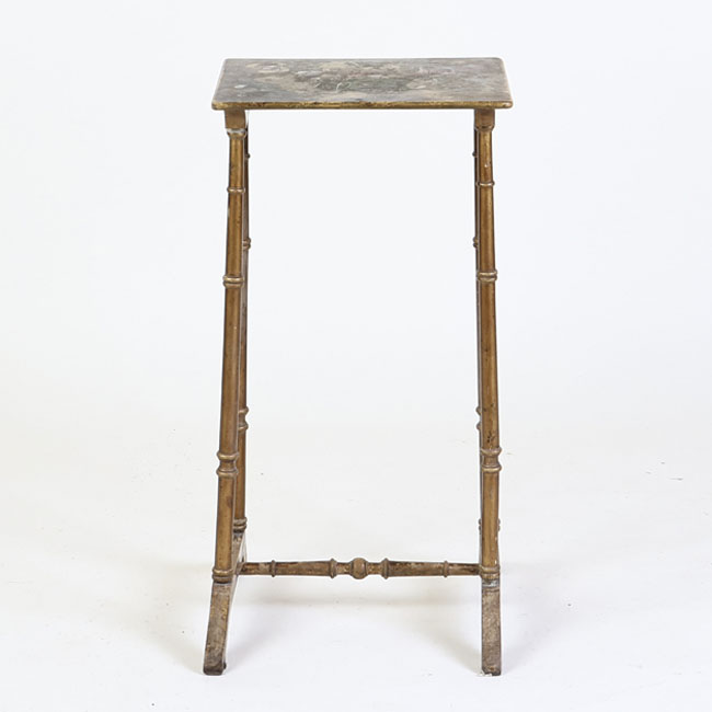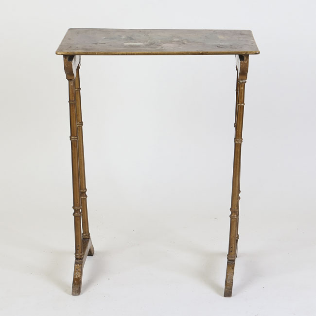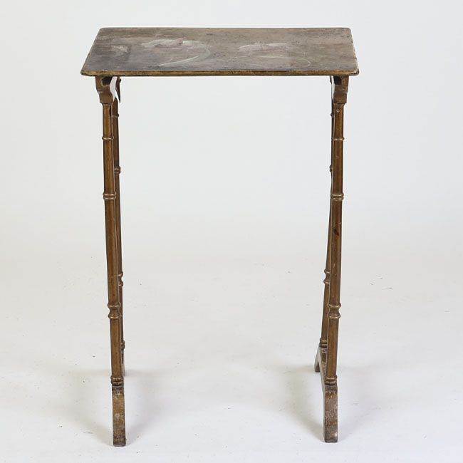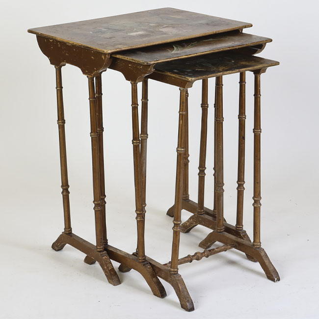 Muebles de apoyo, es en un conjunto de tres mesas auxiliares encajables de formato rectangular, elaboradas en madera barnizada de tono marrón. Cada mesa presenta una estructura ligera con tablero plano y bordes rectos, sostenido por cuatro patas torneadas que imitan la forma de cañas o columnas delgadas, unidas en la base por travesaños curvos que aportan estabilidad. Las mesas son de diferentes dimensiones, permitiendo su almacenamiento una dentro de otra.