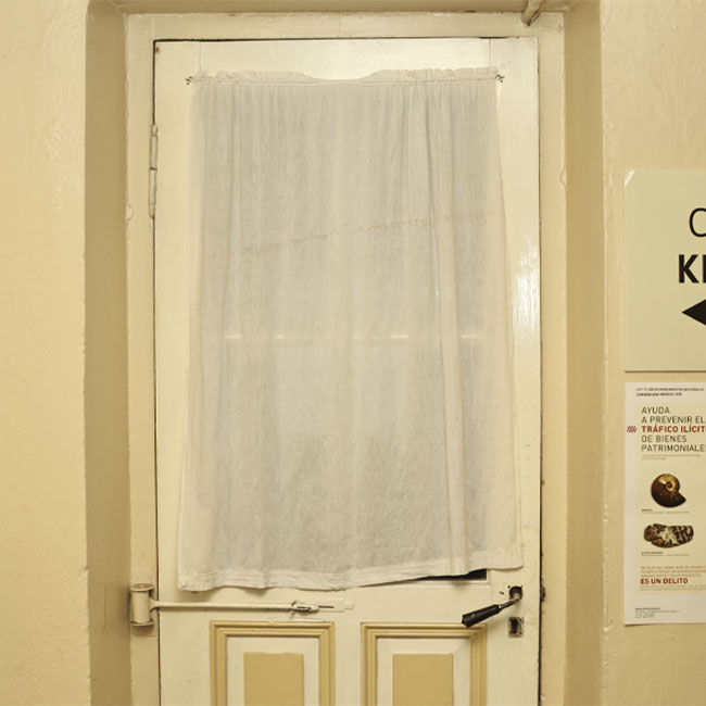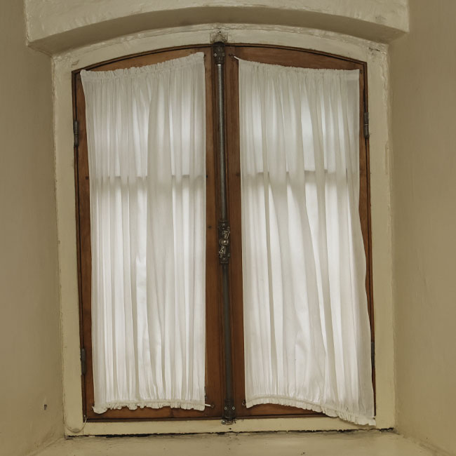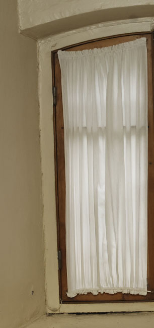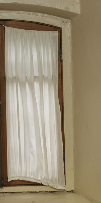 Textil, liviano de color blanco. Las telas presentan un fruncido superior y otro inferior, sujetos a varillas horizontales. La caída de la tela es vertical con pliegues estrechos y regulares a lo largo de toda su extensión.