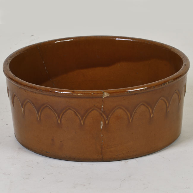 Contenedor cerámico de cuerpo circular y paredes rectas, de tonalidad café anaranjada con acabado vidriado. Presenta en el exterior una banda decorativa en relieve compuesta por una sucesión de arcos apuntados dispuestos en sentido horizontal. El borde superior es ligeramente engrosado y redondeado.
