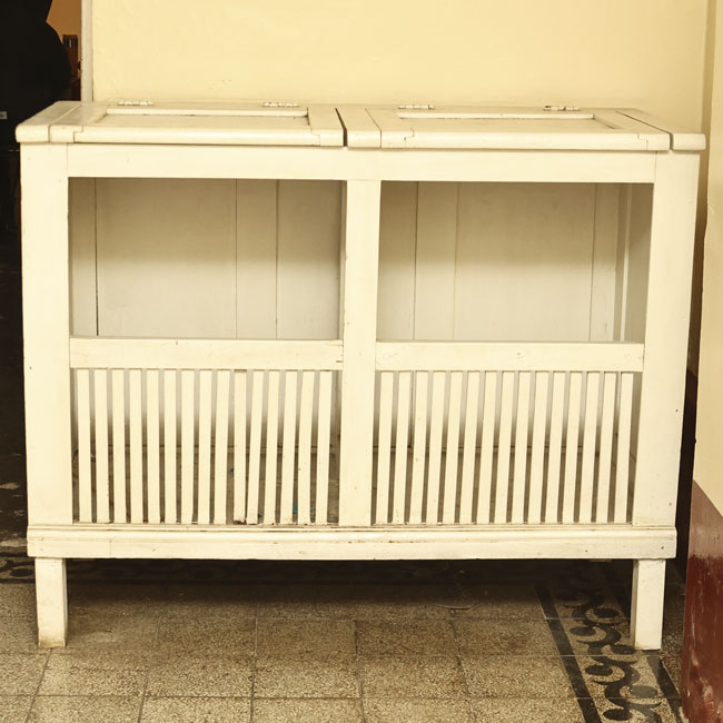 Mobiliario de almacenamiento en madera pintada de blanco, compuesto por dos puertas con listones verticales y paneles abiertos, estructura rectangular y soporte elevado.