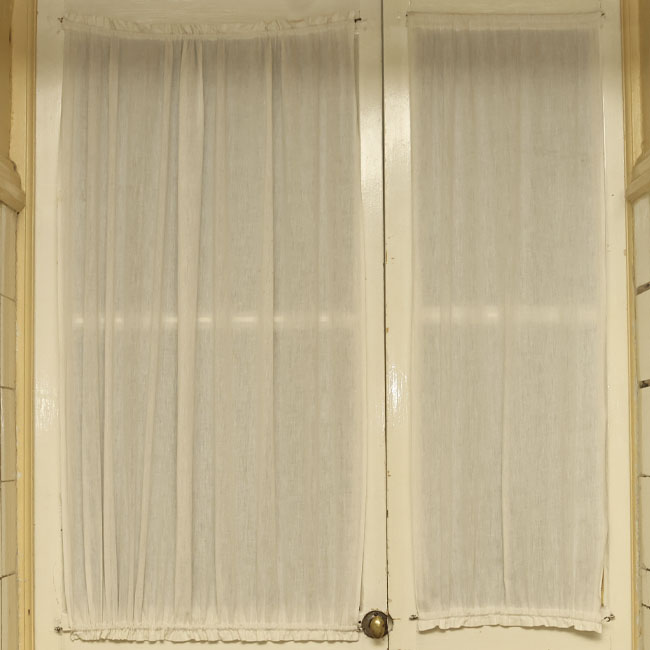 Textil de formato rectangular con decoración en pliegues verticales distribuidos por toda la superficie. Se compone de dos paños en tono claro, cada paño presenta una caída recta y ligera transparencia.