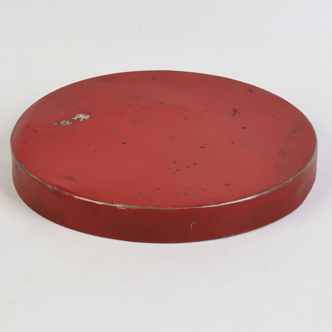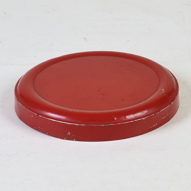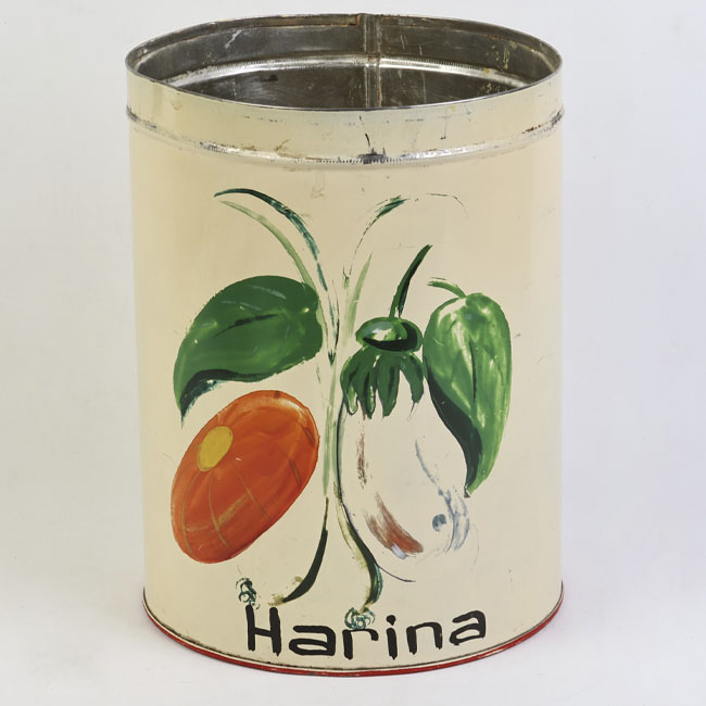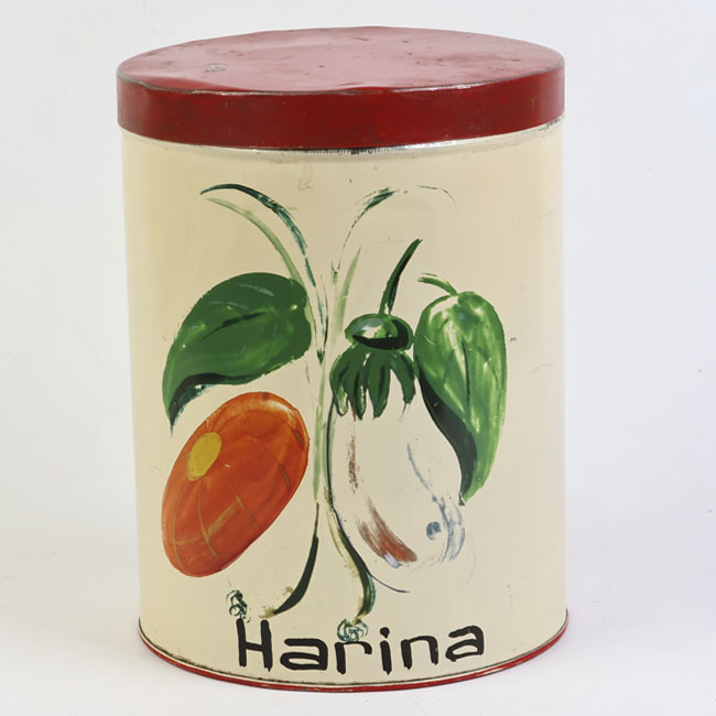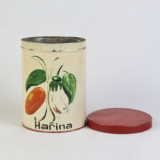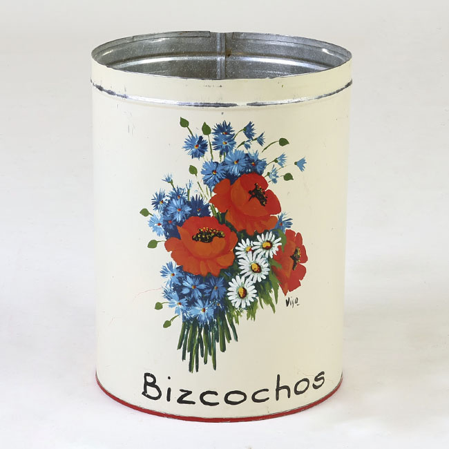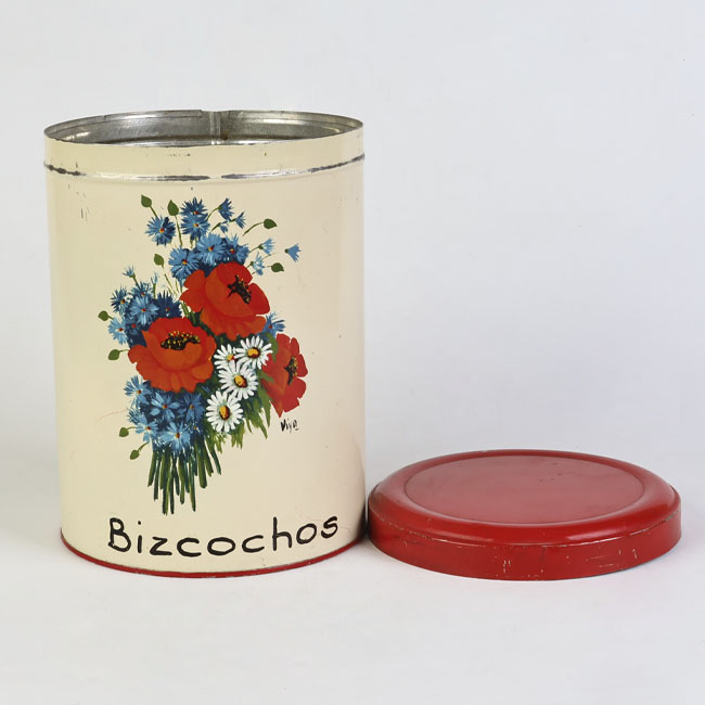 Frasco cilíndrico de metal con tapa y base en color rojo. La superficie del cuerpo es de tono claro y presenta en el centro una ilustración de un ramo de flores.