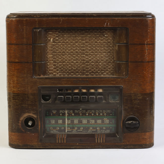 Radio de madera, de cuerpo rectangular, en la parte frontal con rejilla textil superior, panel inferior con dial verde y botones oscuros; perillas laterales y acabado con barniz.