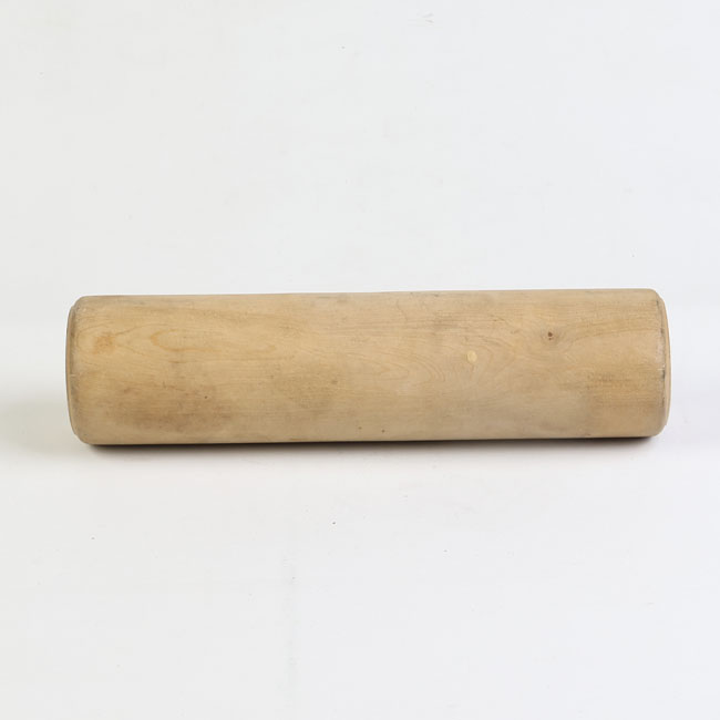 Uslero de madera de una sola pieza, de forma cilíndrica alargada y extremos suavemente redondeados. Carece de mangos y presenta superficie lisa con marcas de uso y desgaste.