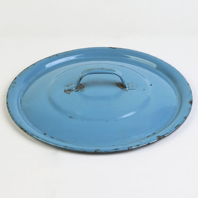Tapa de olla circular de tono azul, con borde ligeramente elevado. Posee un tomador central y superficie lisa de acabado uniforme, sin decoración adicional.