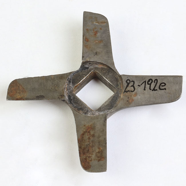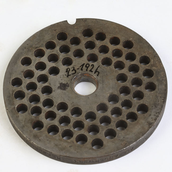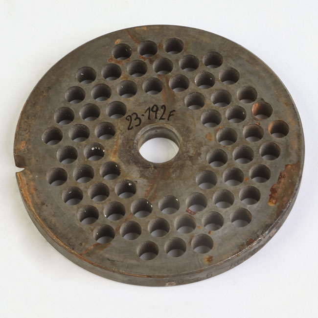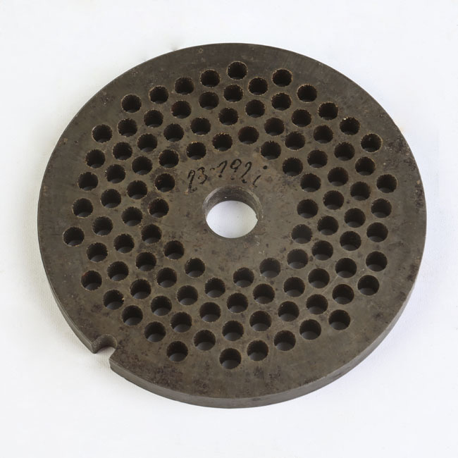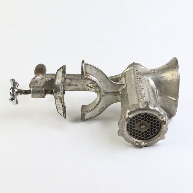 Molino manual metálico con cuerpo cilíndrico, rejilla frontal perforada y embudo posterior. Posee manivela con empuñadura de madera y abrazadera de tornillo para fijación.