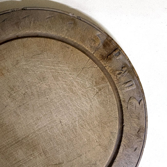 Pieza de madera de cuerpo circular de acabado liso y tallado en la franja de borde, tono natural, bordes redondeados y superficie plana, con vetas visibles. Utilizado para cortar pan.