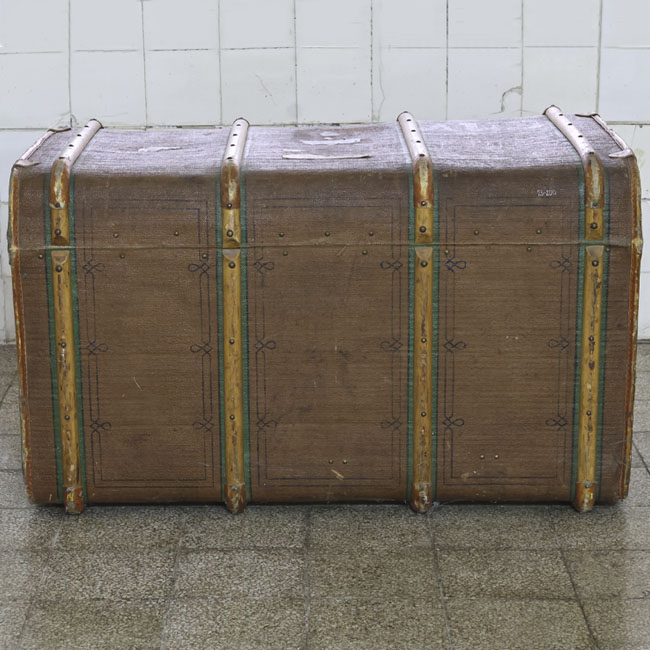 Baúl de forma rectangular, de estructura rígida. Presenta cuatro hileras transversales de tono más claro que recorren el cuerpo del baúl, dispuestas de manera equidistante. La superficie exterior muestra acabado texturizado y bordes definidos.