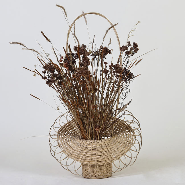 Arreglo compuesto por un canasto tejido en fibra natural, de base cilíndrica y cuerpo expandido con entramado curvo y asas altas arqueadas. Contiene tallos y flores secas de tonos marrones dispuestos verticalmente. El conjunto presenta apariencia ligera y estructura abierta en el tejido.