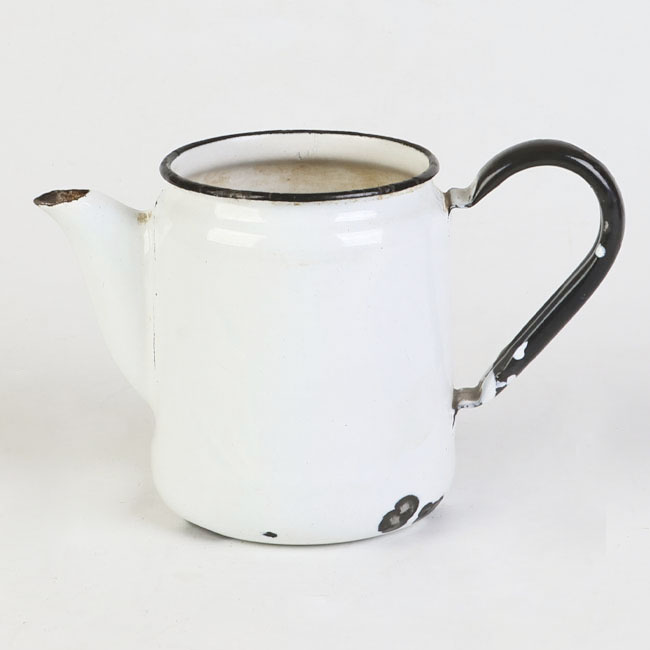 Jarro de metal esmaltado blanco con borde y asa negros. Tiene forma cilíndrica, un pico para verter y un asa lateral. Ideal para líquidos, con un diseño simple y funcional.