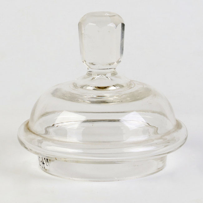 Tapa de vidrio transparente, con forma de campana, de superficie lisa y contorno circular. Presenta un tomador central sólido integrado en la parte superior, también de vidrio, utilizado para su sujeción. Los bordes inferiores son rectos y uniformes, diseñados para apoyar sobre una base.