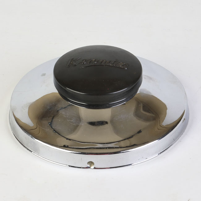 Tapa metálica de contorno circular, de superficie lisa y acabado uniforme. Presenta un tomador central de color negro, de forma cilíndrica ligeramente abombada, fijado en la parte superior para facilitar su sujeción. El borde inferior es continuo y regular, diseñado para encajar sobre una base