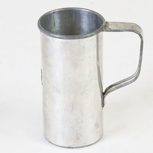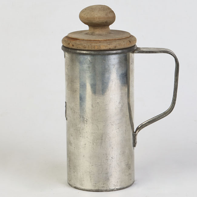 Recipiente de uso doméstico que corresponde a una jarra metálica de color plateado y cuerpo cilíndrico, con paredes lisas y base de forma circular. En el extremo superior, se observa una boca ancha y sobre ella una tapa de madera con un tomador central. De la pared externa nace un asa curva.