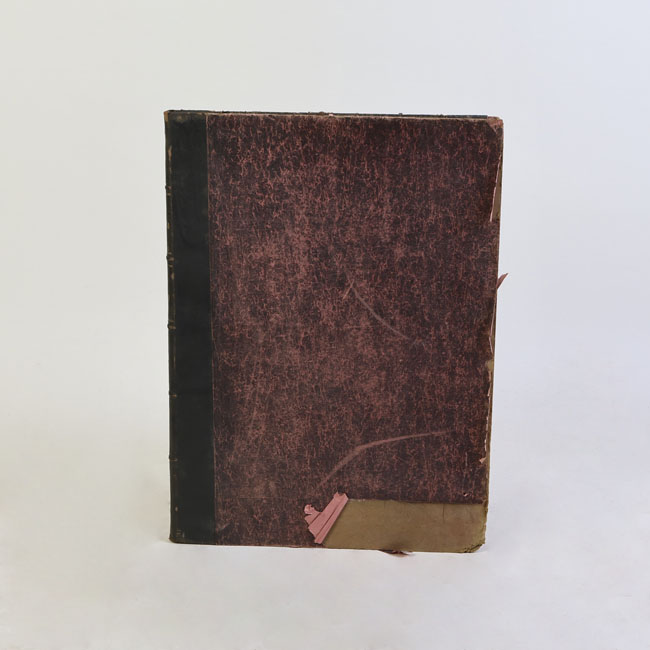 Libro de forma rectangular y de gran grosor, con tapas rígidas forradas en tonos oscuros y lomo ancho. En su interior contiene hojas con recortes de prensa.