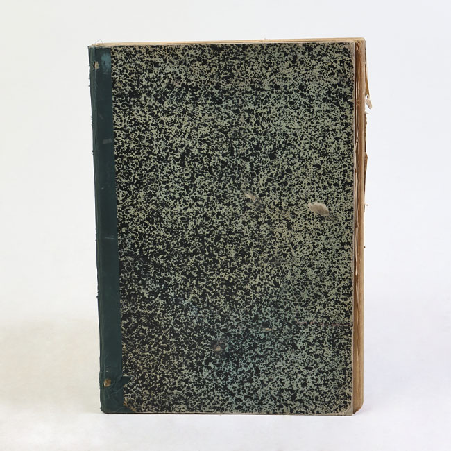 Libro de forma rectangular y de gran grosor, con tapas rígidas forradas con patrones de puntos en verde y negro y un lomo ancho. En su interior contiene hojas con recortes de prensa.